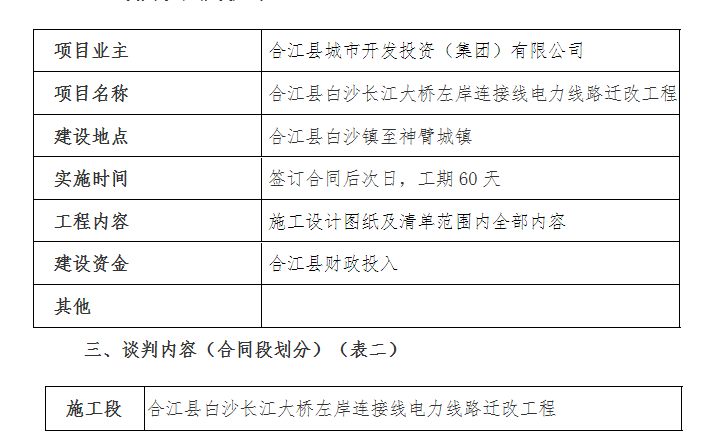 一、 本次談判項目為合江縣白沙長江大橋左岸連接線電力線路遷改工 程, 現(xiàn)通過競爭性談判方式選擇和確定承包人, 誠邀符合資格條件的 潛在申請人參與本項目的競爭性談判。